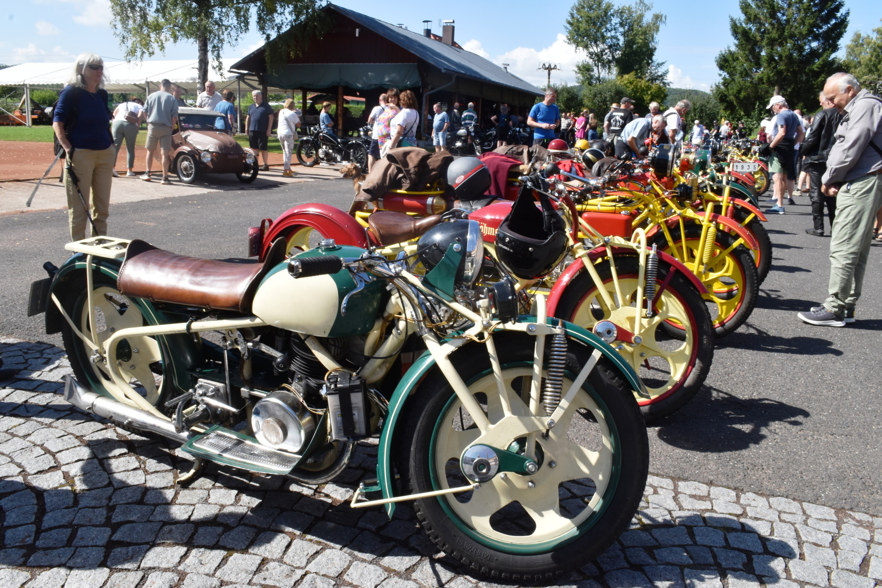 Po exkurzi jsme na dvoře pivovaru narazili na nečekanou atrakci: byl tam mezinárodní sraz historických motocyklů Čechie-Böhmerland, který se tam zastavil při spanilé jízdě severočeským a jihoněmeckým pohraničím. Krásné stroje vyráběné v meziválečném období v severočeské Krásné Lípě jsou „nejdelšími motocykly světa“ a bylo jich tam několik desítek, což byla prý tak polovina všech strojů této značky, které se dochovaly.