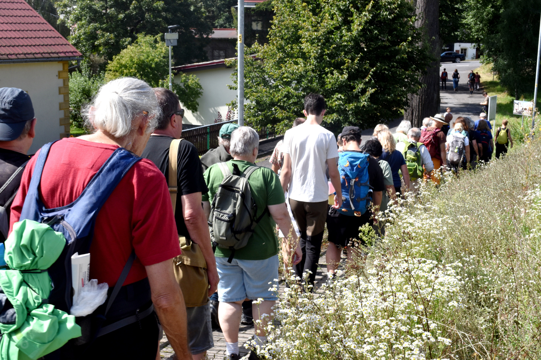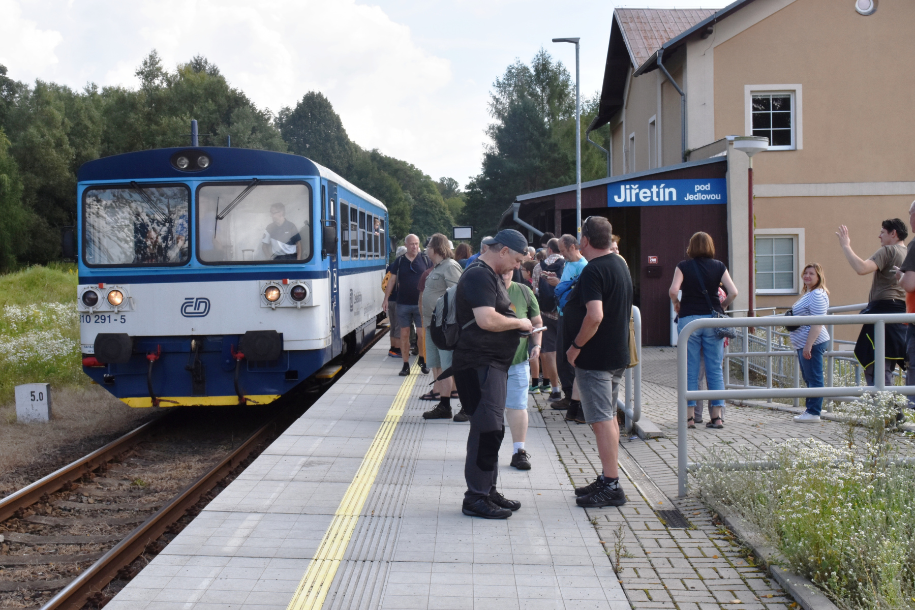 Následovalo trochu turistiky. Náš motoráček v sobotu odpočíval a tak jsme pravidelným spojem odjeli do Jiřetína pod Jedlovou a přes vrch Jedlová s rozhlednou a restaurací – někteří to stihli i přes Tolštejn (známe ze zakončení 8. a 50. Stezky) – jsme došli do stanice Jedlová s vyhlášenou nádražkou, v které jsme vyčkali podvečerního vlaku zpět k pivovaru.