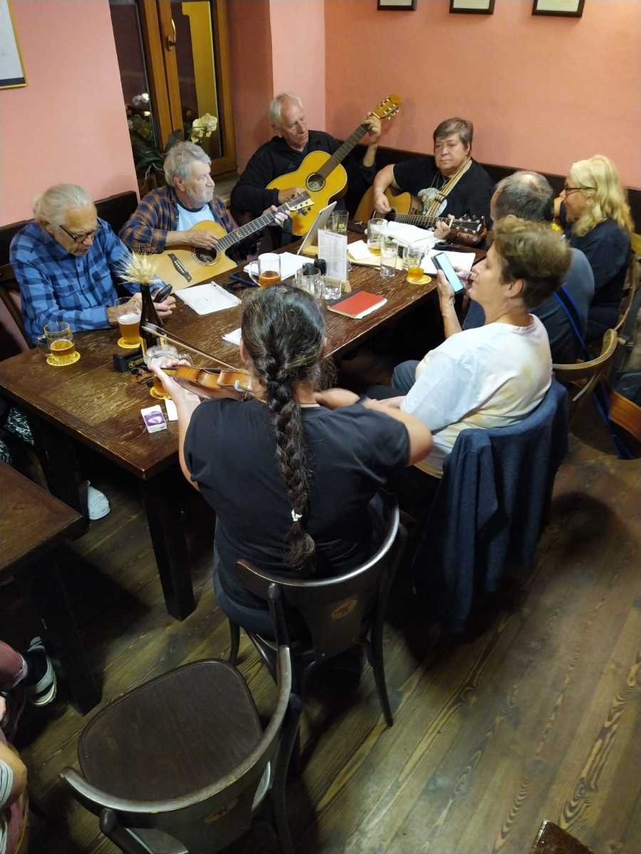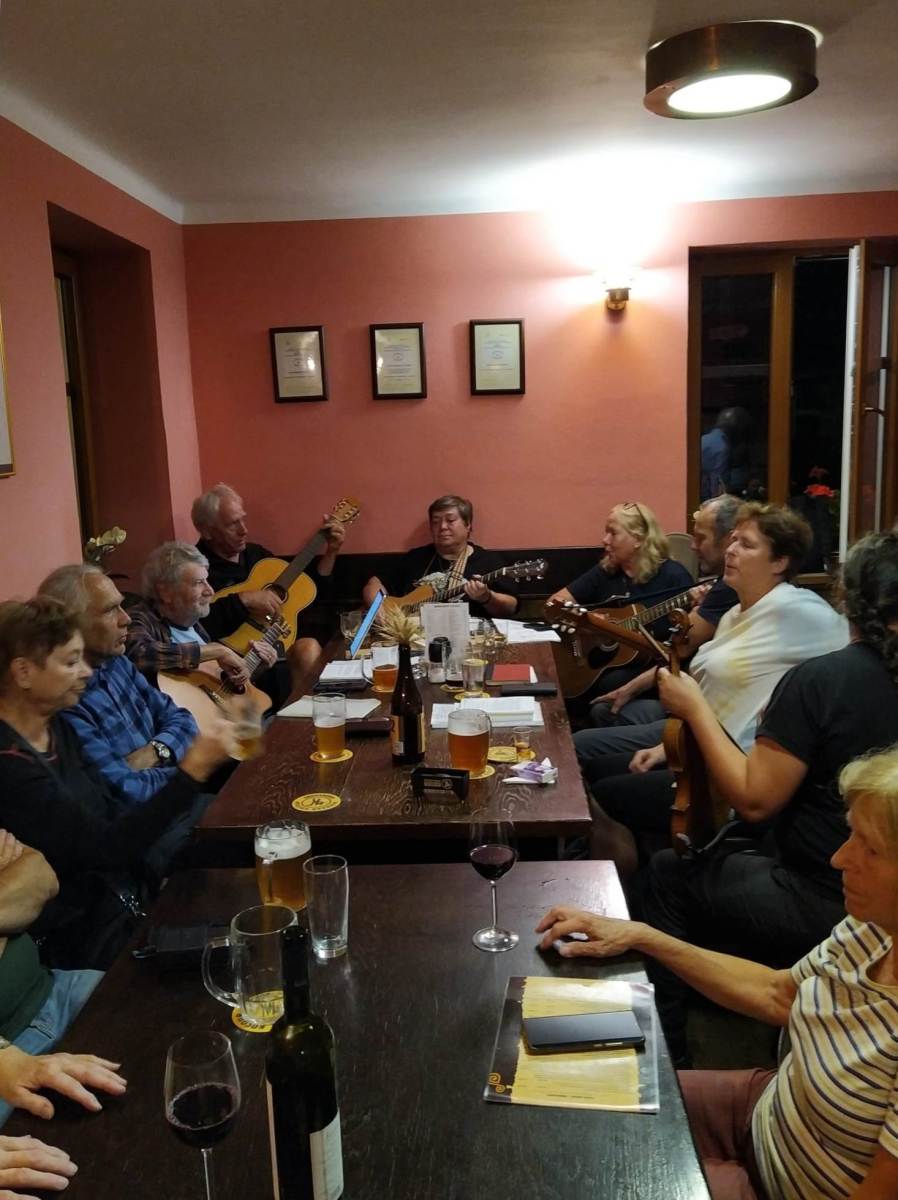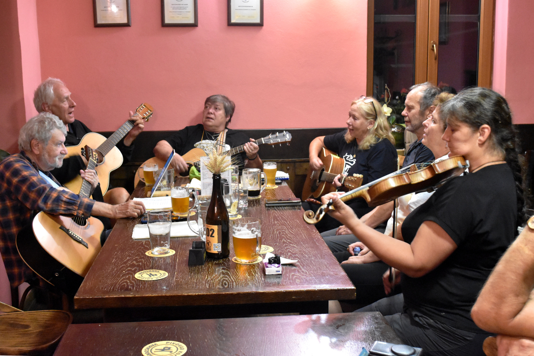 V pivovarské restauraci u Kocoura byla stejně jako včera připravena bohatá večeře a po ní jsme mohli porovnávat chutě všech zdejších piv. Dal jsem si taky jedno „řezané“ a dlouho jsem neviděl tak vzorně natočené s přesným rozhraním mezi tmavým pivem dole a světlým nahoře. A pak už, jak je na TAKových akcích dobrým zvykem, hrála hudba a zněl zpěv.