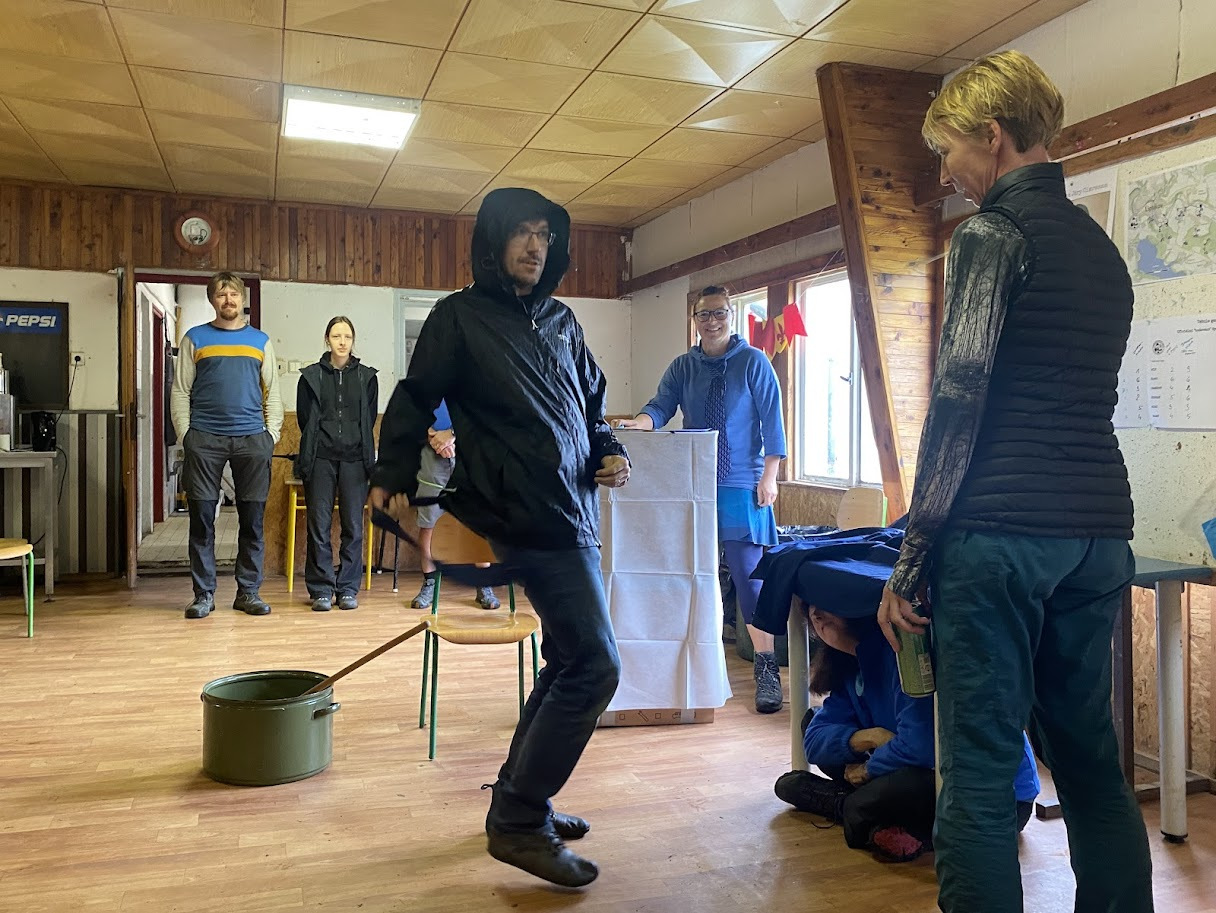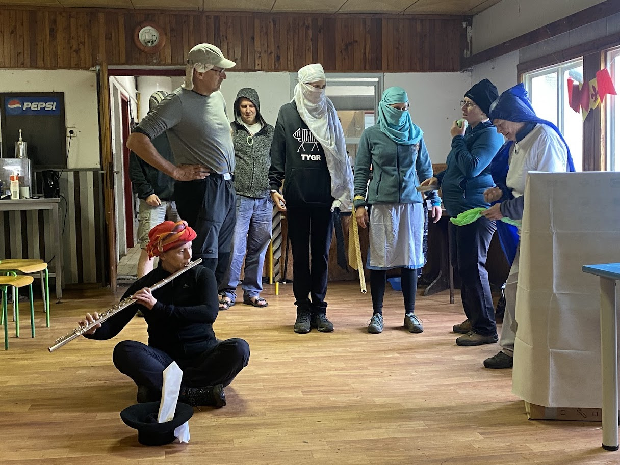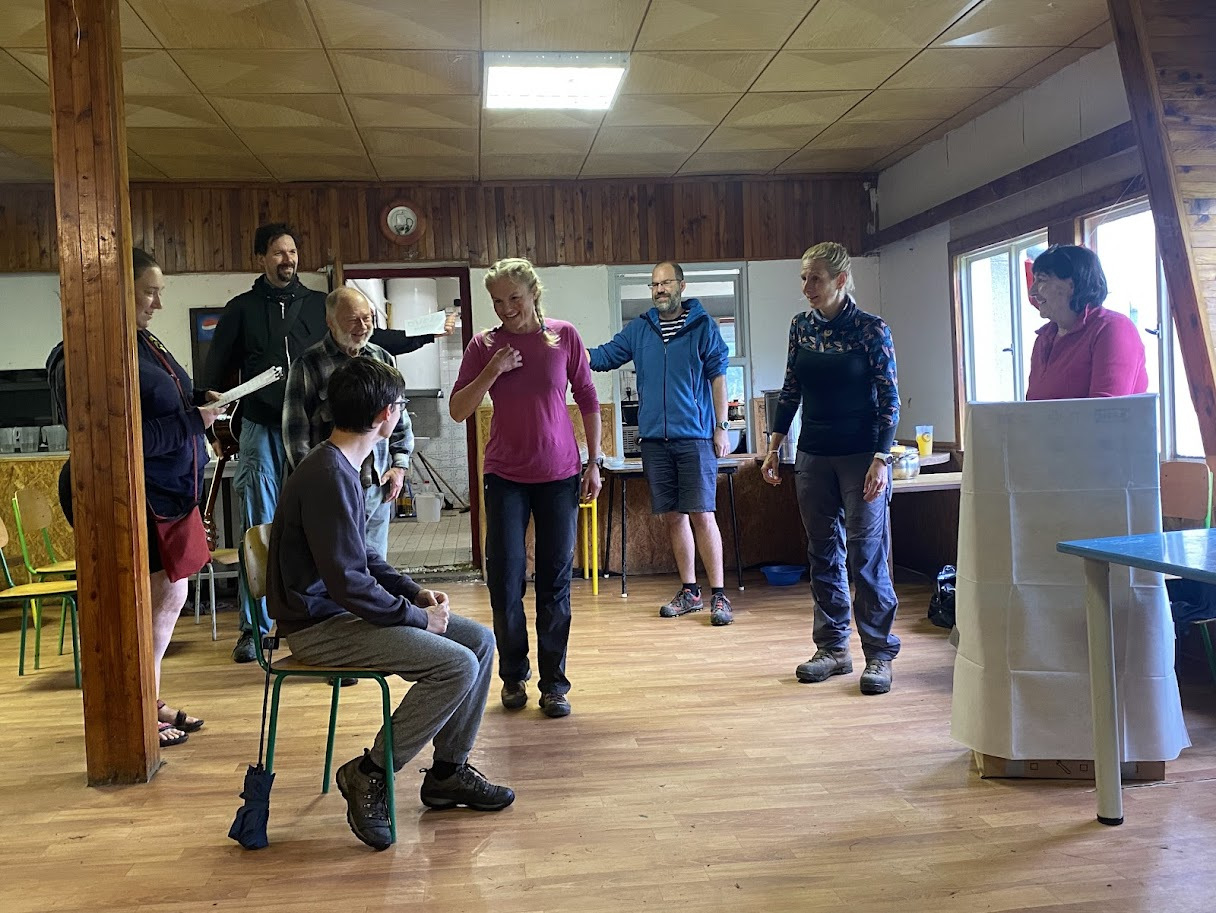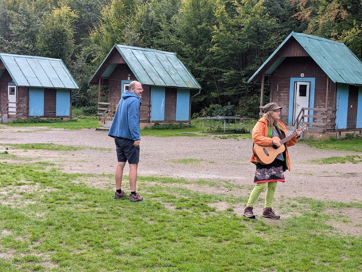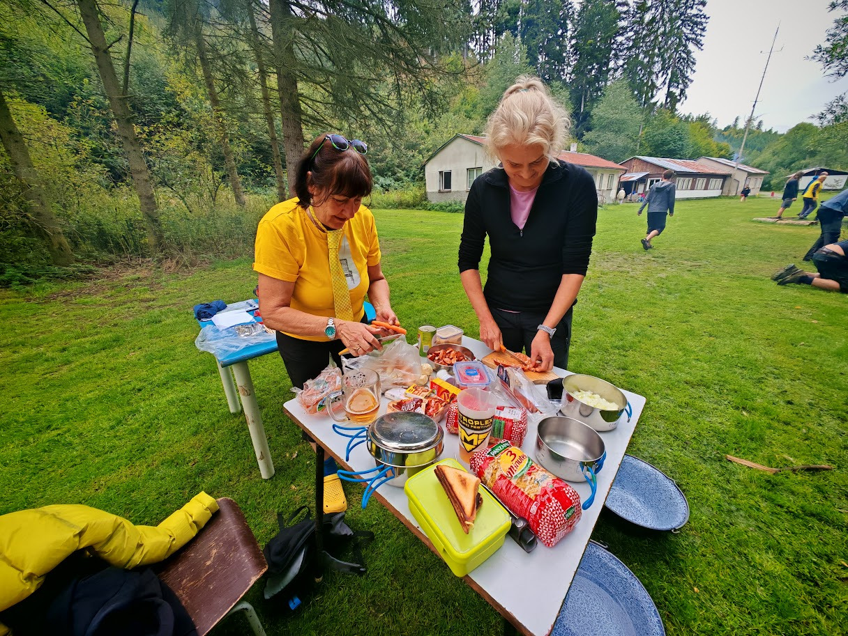 Ráno zase deštivé, ale Janina kytara a zpěv všechny ze stanů i chatek vylákaly do jídelny – na teplé nápoje, polévku i česnekovou pomazánku. Následovala pomoc s bramborami a cibulí a drobné váhání, zda se dramatická tvorba odehraje uvnitř, nebo venku. Hrajeme uvnitř – 6 představení, každé prezentuje 5 zásad nebo typických prvků z divadelní tvorby Járy Cimrmana. Nevím jak vy, ale já se tedy bavila náramně.