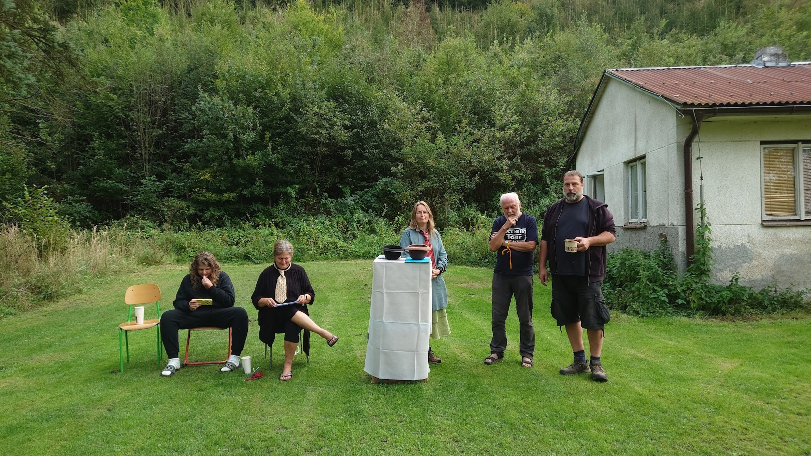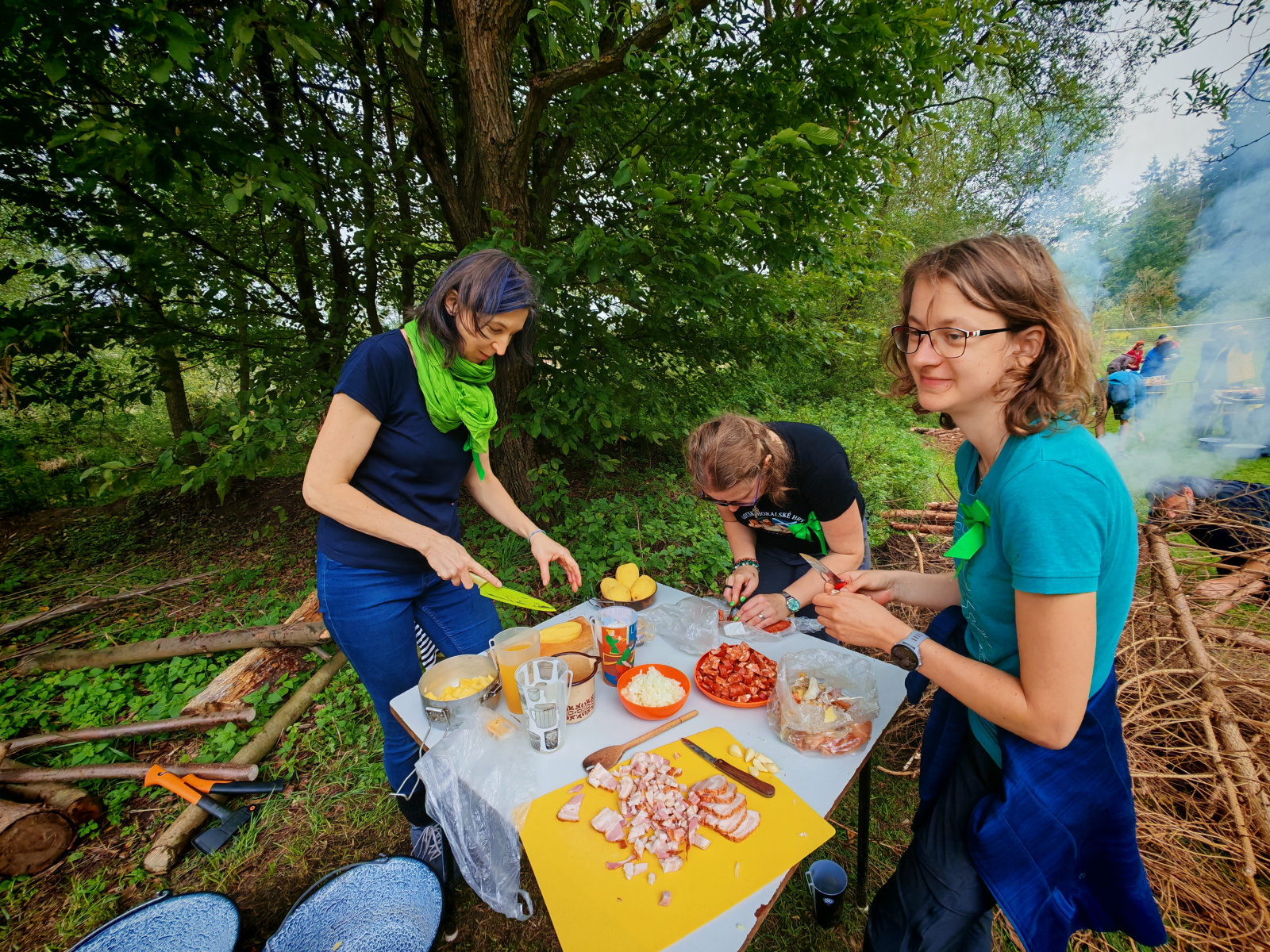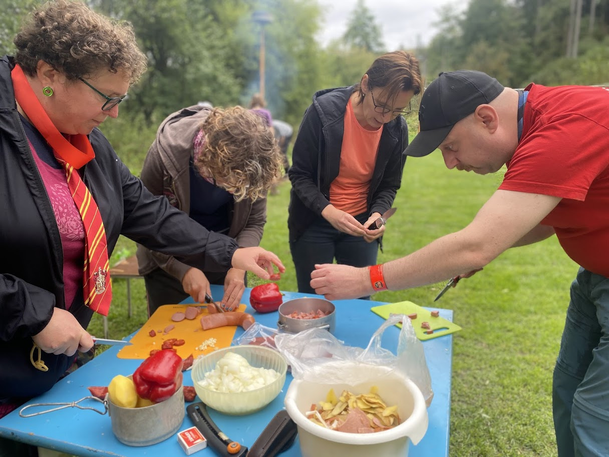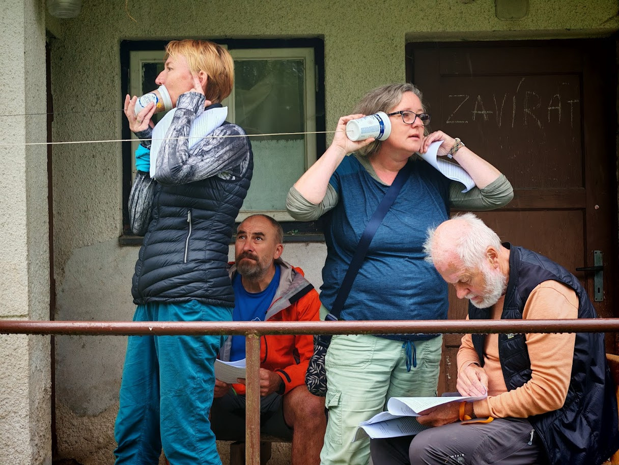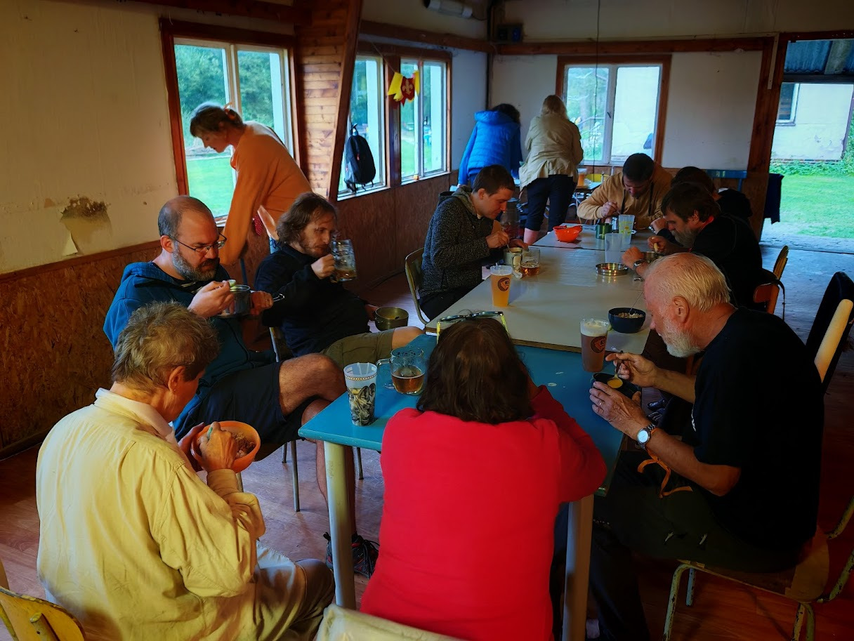 Ráno zase deštivé, ale Janina kytara a zpěv všechny ze stanů i chatek vylákaly do jídelny – na teplé nápoje, polévku i česnekovou pomazánku. Následovala pomoc s bramborami a cibulí a drobné váhání, zda se dramatická tvorba odehraje uvnitř, nebo venku. Hrajeme uvnitř – 6 představení, každé prezentuje 5 zásad nebo typických prvků z divadelní tvorby Járy Cimrmana. Nevím jak vy, ale já se tedy bavila náramně.