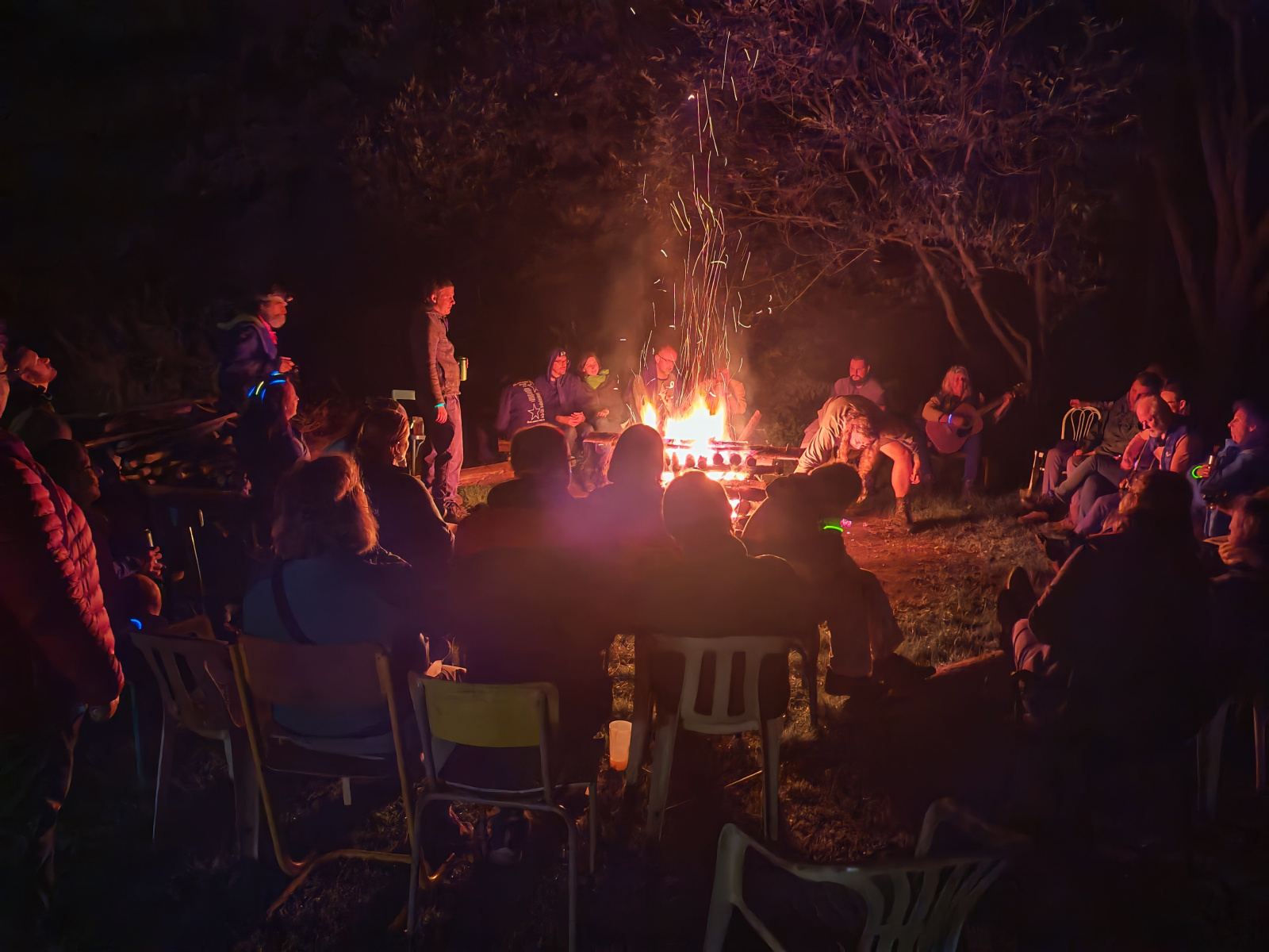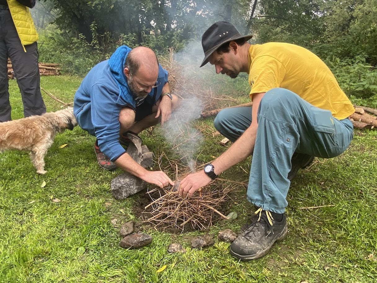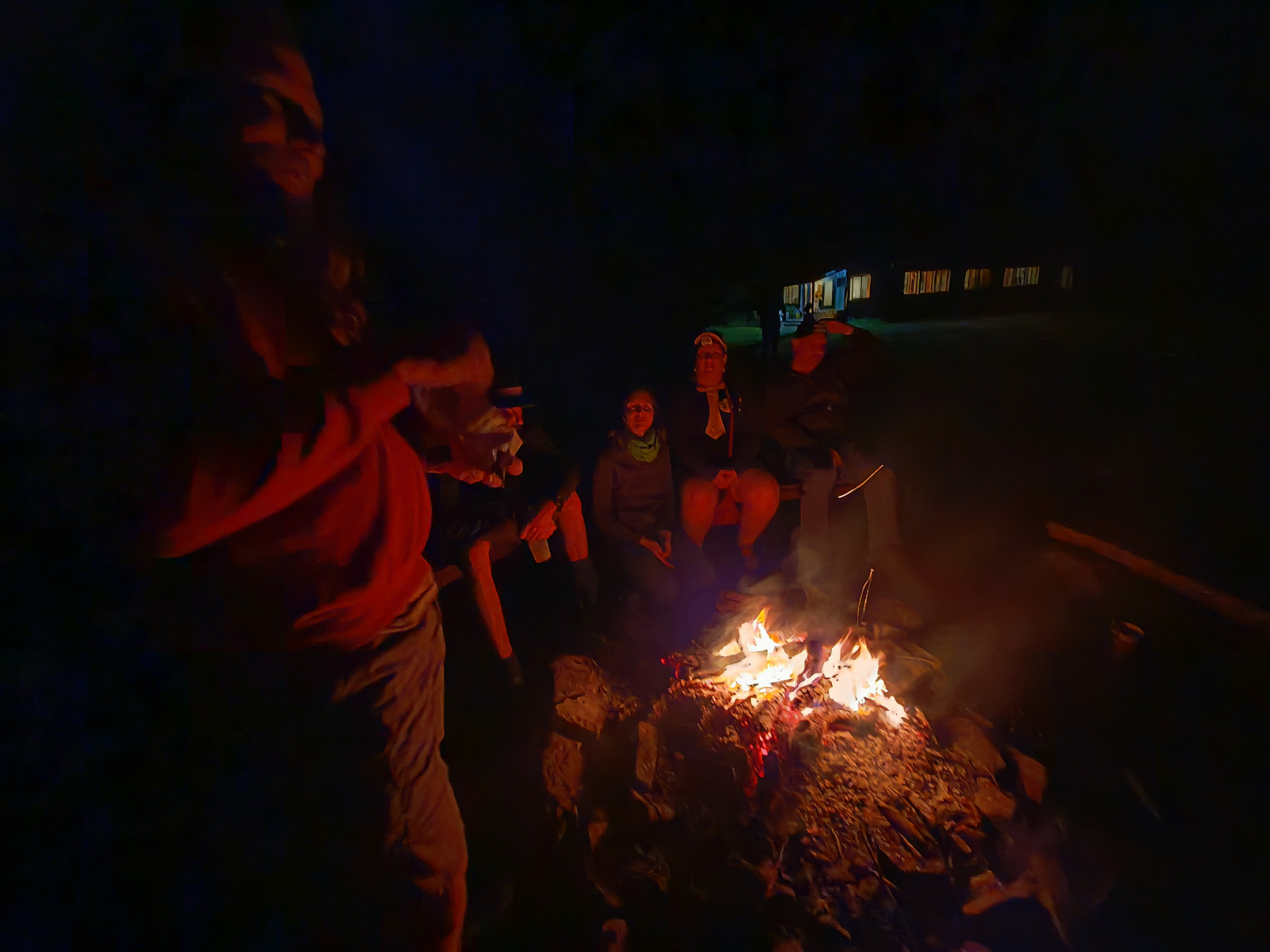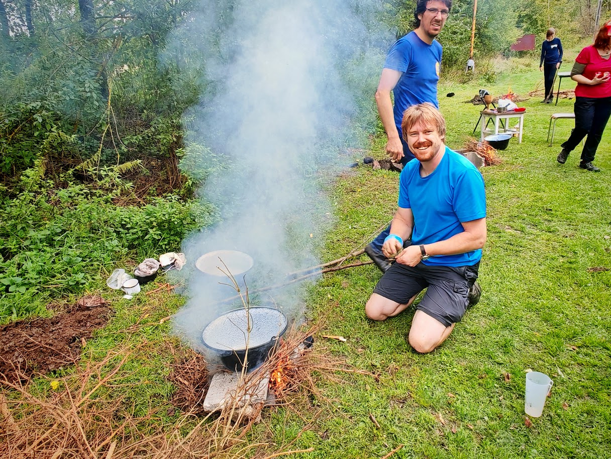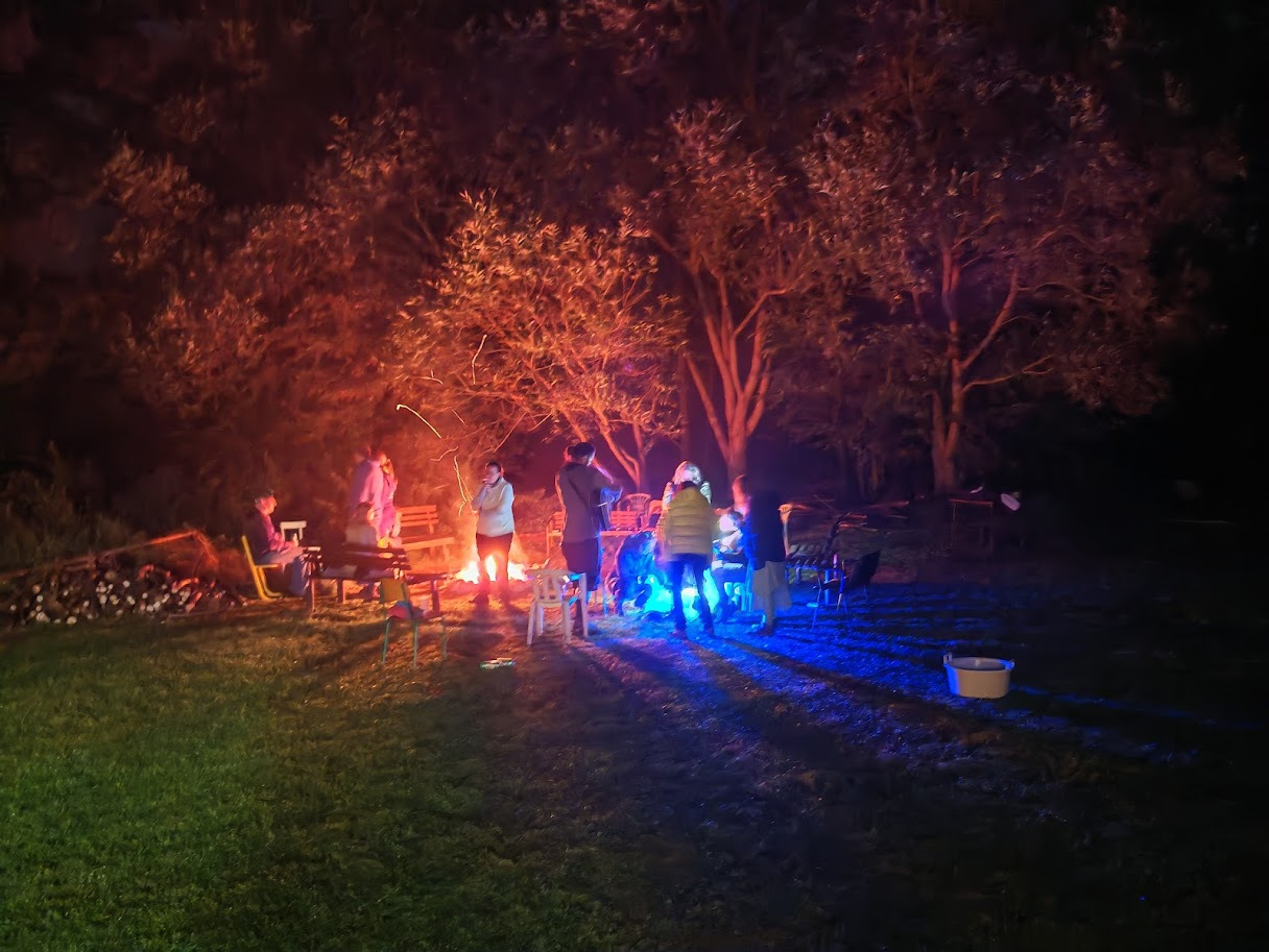 A už nastal čas na oheň. Zapálení nás díky mokrému dřevu potrápilo, ale nakonec to vyšlo. Hrálo se až do tří hodin. V jídelně byla po celou dobu k zakousnutí česneková pomazánka – opět od Martinky.