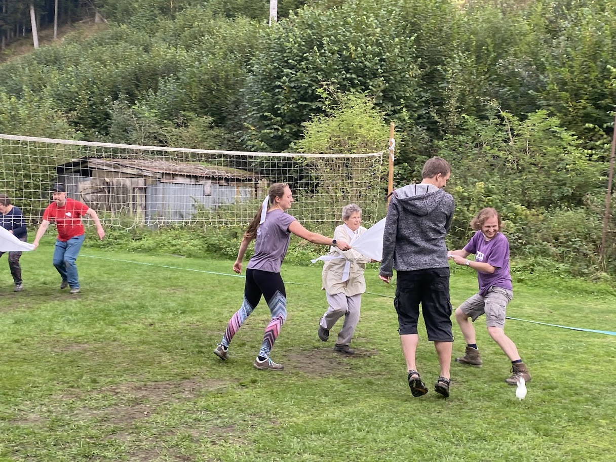 Po kultuře přišlo zase trochu pohybu. Štafeta Dr. Žáby – přes drobné překážky ve spojení pravou rukou. Při této hře jste mě doslova dojali svou hravostí. Ano, šlo i o čas, ale vy jste si to prostě užívali. A zelení dokonce vylepšili běh o deštník a drobné posezení u stolečku.
